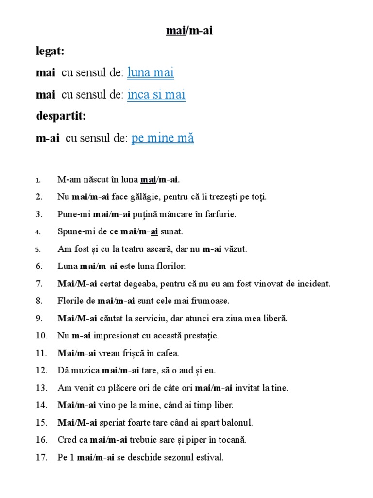 Vorbește mai tare pentru că nu te aud. Mai bine decat si in situatii precum mai trebuie mai spune mai poti etc m ai se foloseste doar cu persoana de intai singular folosit cu cratima pentru ca ar fi fost ma ai si s a facut forma m ai ex. Mai vino pe la mine când ai timp liber. Pe 1 mai se deschide sezonul.