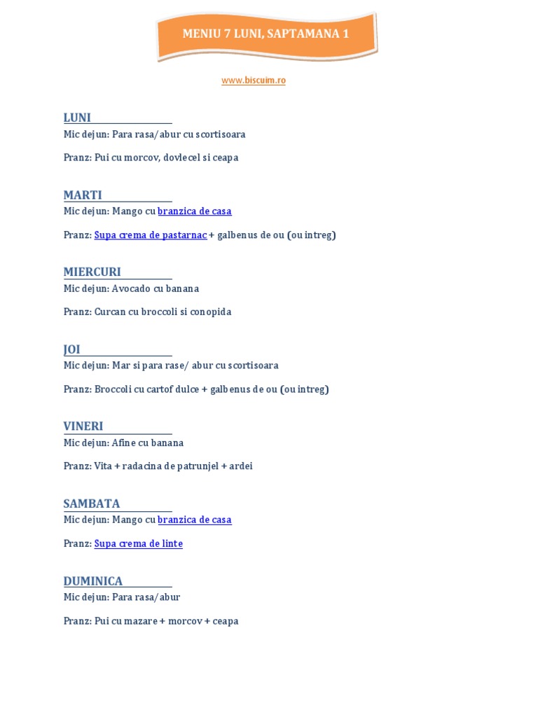 Meniu bebe 7 luni. De asemenea nu sunt retete speciale pentru 7 luni la masa de fructe veti oferi fruct simplu iar la pranz legume si proteina. Alimente pentru bebelusii de 7 luni retete pentru bebelusii de 7 luni. On 01 29 10 in 7 luni 8 luni 9 luni 10 luni 11 luni 12 luni 2 ani 3 ani by ramona. A trecut si prima luna de diversificare.