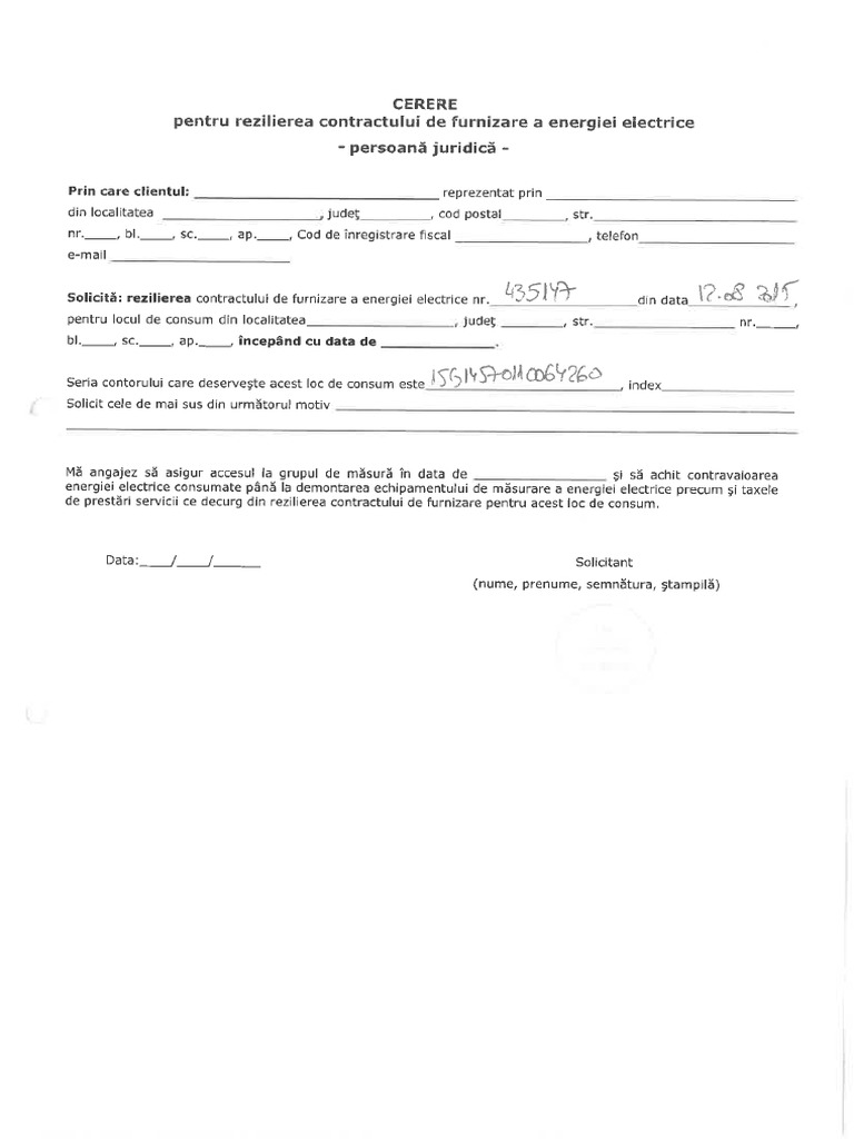îţi garantez că toate informaţiile îţi vor fi de folos pentru tine sau pentru afacerea ta. 1 cerere de acordare servicii persoane juridice. Cerere pentru incetarea contractului pentru serviciile telekom romania formularul completat si semnat de reprezentantul legal al companiei se va trimite prin e mail impreuna cu certificatul de inregistrare fiscala documentul de imputernicire la adresa b2breziliereservicii telekom ro date identificare client. Cerere de reziliere a contractului persoane juridice.