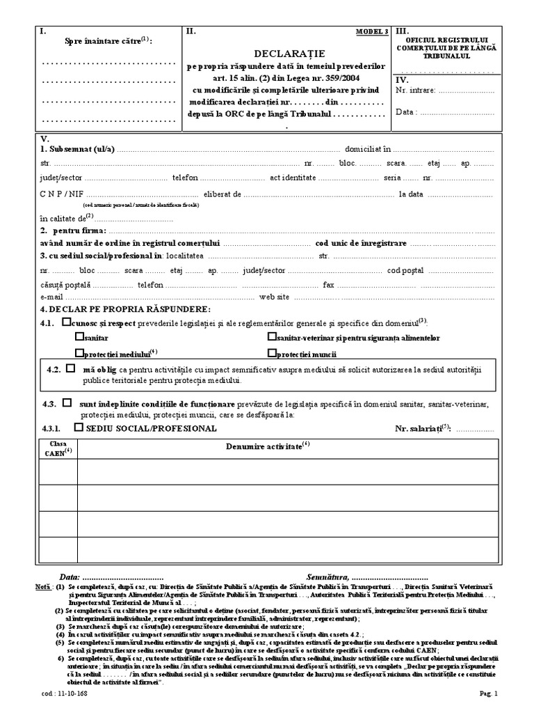De telefon la fiecare sediu codul caen al fiecarei activitati pentru care se solicita autorizarea grupate pe sedii si nr. Declarație pe proprie răspundere. Se va completa adresa locuinței în care persoana locuiește în fapt indiferent dacă este identică sau nu cu cea menționată în actul de identitate. De salariati aferenti activitatii respective.