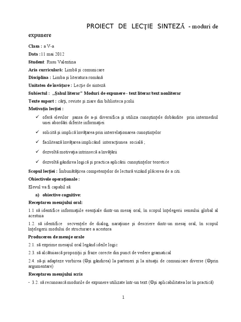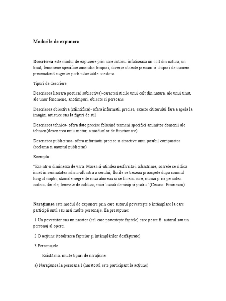 Moduri de expunere exemple. Care sunt modurile de expunere descrierea dialogul exemple intâmplări modurile de expunere monologul naratiunea opere literare. Naratiunea este modul de expunere prin care se relateaza intr o succesiune temporala fapte si intamplari. Moduri de expunere descrierea este un mod de expunere prin care scriitorul prezinta in amanuntele lor specifice si impresionabile un colt din natura peisaj un obiect un fenomen o fiinta chpul unui om un mediu social o stare sufleteasca intr o descriere literara in proza sau in versuri pe lânga prezentarea unor elemente definitorii pentru obiectul descrierii scriitorul da glas si. Din punct de vedere literar intalnim mai multe moduri de expunere.