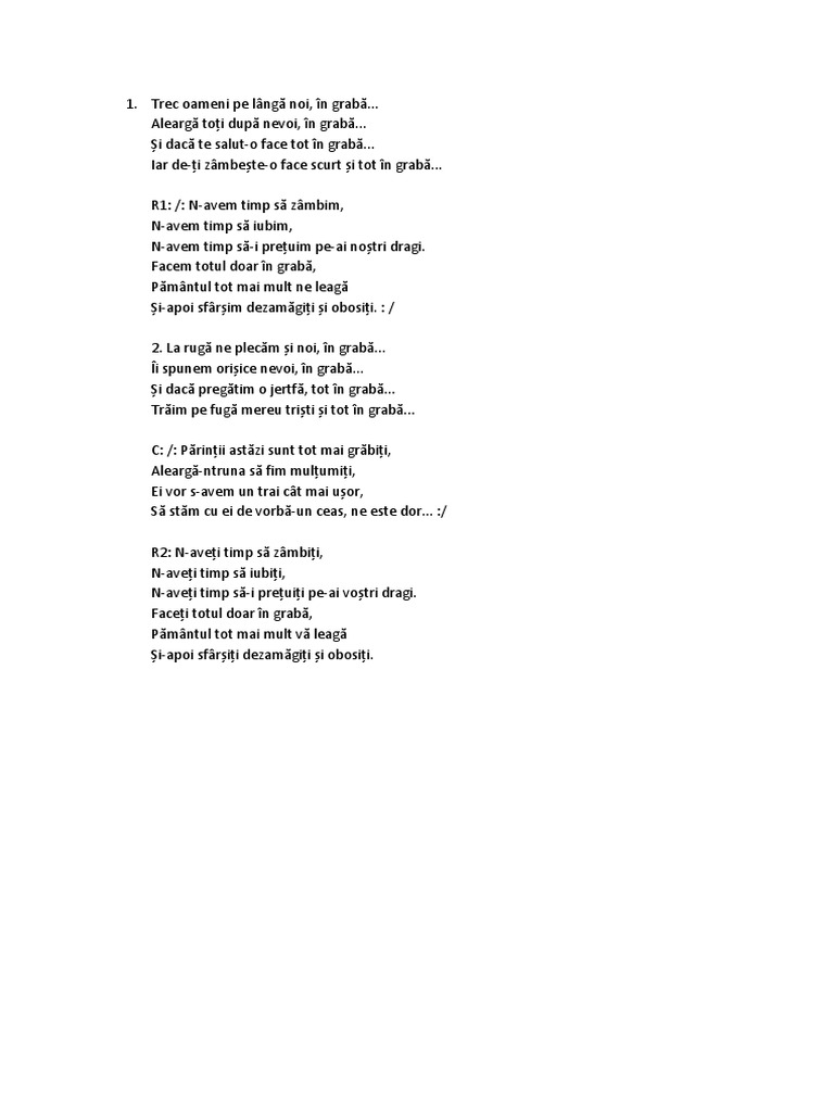 N avem timp. F c facem totul doar în grabă g a pământul tot mai mult ne leagă d g c și apoi sfârșim dezamăgiți și obosiți. Dar n avem timp pentru lucrurile cu adevărat importante iar când să facem şi asta murim încheie paler. Facem totul doar în grabă pământul tot mai mult ne leagă și apoi sfârșim dezamăgiți și obosiți. La rugă ne plecăm și noi în grabă.