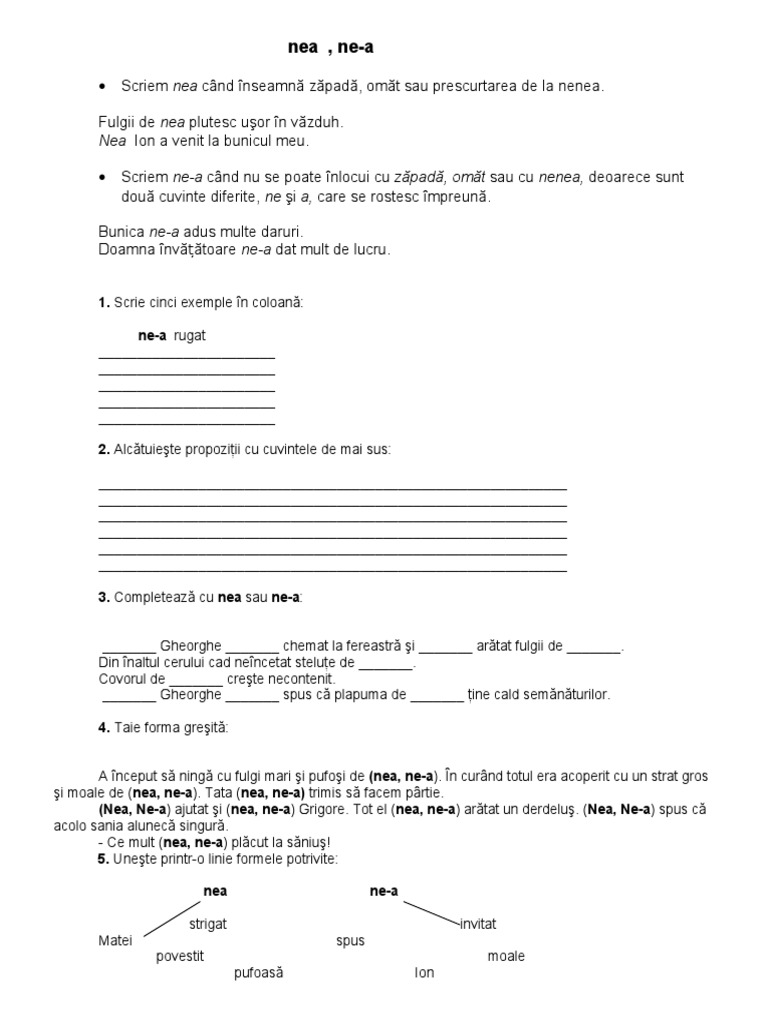 Nea sau ne a. Spunem corect i a dat i a inmanat i a placut in schimb ia vine de a lua ia mana de pe calculator. Doamna învățătoare ne a urat succes în noul an școlar. Pe cercurile mai mici copiii vor alcătui propoziții cu aceste cuvinte și vor colora casetele care conțin cuvinte scrise corect. Substantive sinonime zăpadă omăt nene sau interjecţie nea nea.