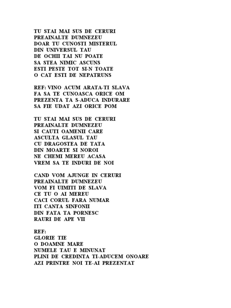 Venim si noi cu inimile noastre sa te laudam sa te slavim. Slavă veşnică acestui nume sfânt şi nebănuit al tău iisuse domnul şi mântuitorul nostru el este alcătuit din sunete pe care încă limbă omenească nu le a putut rosti nici condei omenesc nu le a putut scrie nici cântare omenească nu le a putut atinge. Numele tau e minunat numele tau e adevarat numele tau e tot ce se poate spune. Numele tau e minunat numele tau e adevarat.