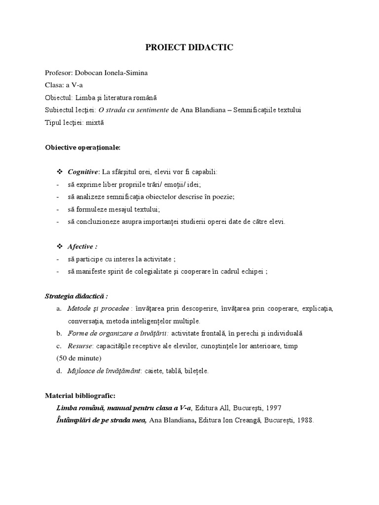 Limba şi literatura română lecţii plan lectie cls v o strada cu sentimenete.