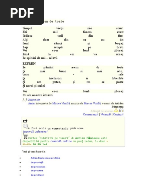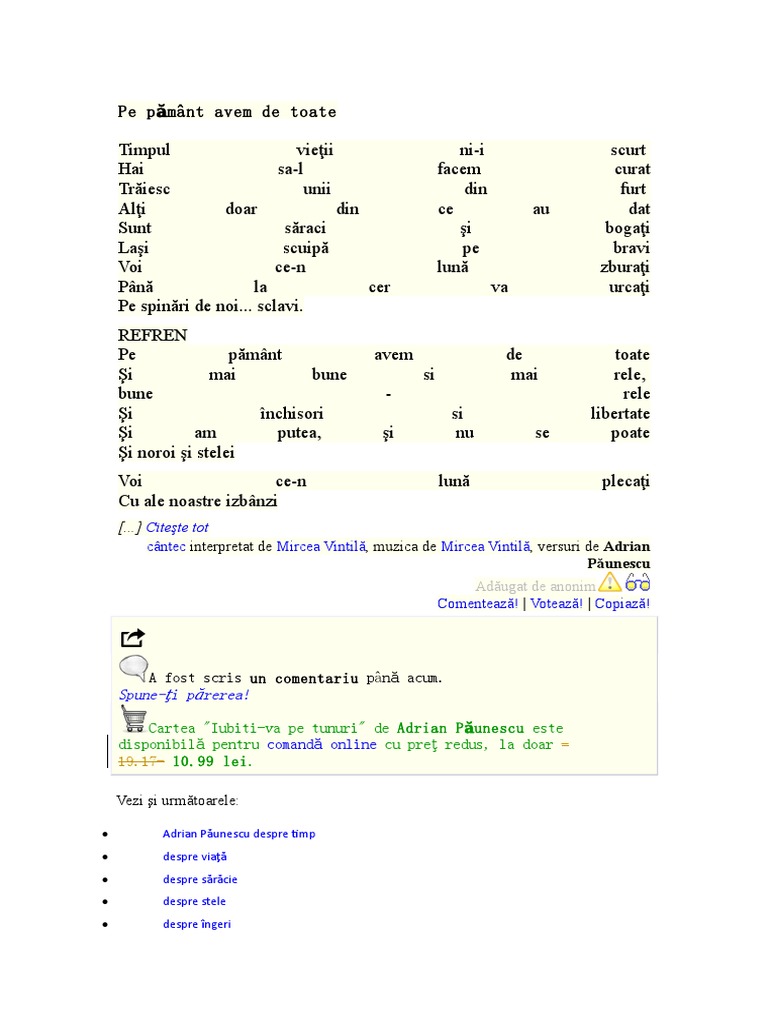 Pe site găsiți 9494 cântări versuri creștine cu tematica copii colinde an nou cină nuntă paști tineret diverse și cărți de cântari. Voi ce n luna plecati cu ale noastre izbanzi nu uitati c aveti frati pe planeta flamanzi painea lor o mancati printre stele zburand. Pe pământ avem o luptă ce n cuvânt e arătată lupta credinţei sfântă ce de domnul e trasată să luptăm cu râvnă mare până domnul va veni căci prin orice încercare doar luptând vom birui. Viata pentru toti imparte.