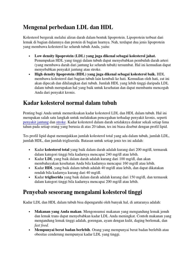 Sebagian besar plak pada arteri disebabtkan oleh small dense ldl. Ldl low density lipoprotein dan hdl high density lipoprotein adalah dua jenis lipoprotein yang diklasifikasikan berdasarkan kepadatannya. Apo a 1 adalah apo terbanyak pada serum apo utama dalam hdl dan kilomikron dan juga kofaktor dari lcat. Ada banyak perbedaan lain antara ldl dan hdl tetapi penting untuk mengetahui apa itu kolesterol sebelum melihat perbedaan perbedaan ini.