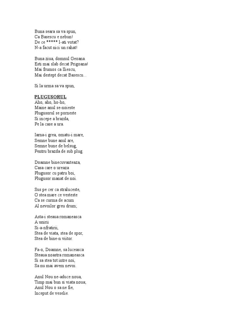Anul vechi s anserat anul nou s a luminat si n am gătit de urat. Versurile vechi originale ale plugușorului s au păstrat în mai multe variante în funcție de zona geografică strigătura populară având și astăzi forța de a uni suflete românilor în pragul noului an aducând în case bucurie și speranță pentru lunile. S a sculat mai an badica traian si a încalecat pe un cal învatat cu numele de graur cu seaua de aur cu. Si a fost vreme mai de mult dar noi nu ne am priceput că suntem aşa de mici că abia pocnim din bici.