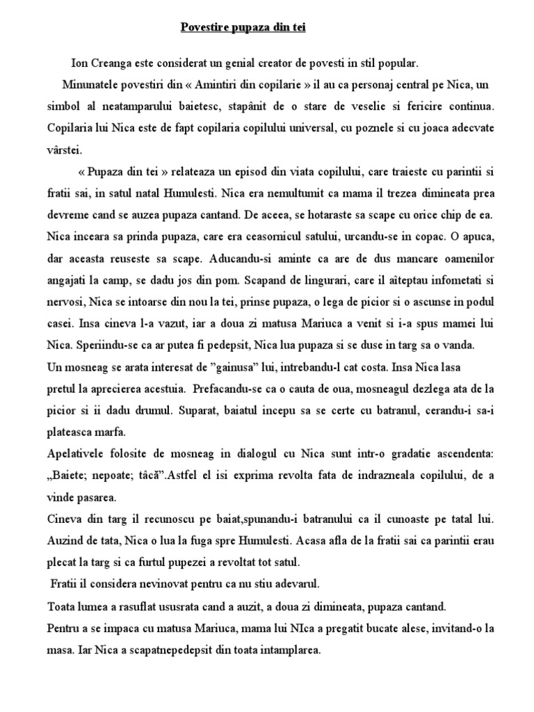 Deoarece sunt esențiale pentru funcționarea funcționalităților de bază ale site ului. Două rezumate scurte la povestirea pupăza din tei scrisă de scriitorul roman ion creangă și inclusă in capitolul 2 al volumului amintiri din copilărie. 2 rezumate la celebra poveste pupăza din tei în care este vorba despre nică care supărat că este trezit devreme de mama lui îi pune gând rău pupezei care cânta în fiecare dimineață ca un cuc deșteptător. Pupaza din tei mă trezește mama într o dimineață din somn cu vai nevoie zicându mi.