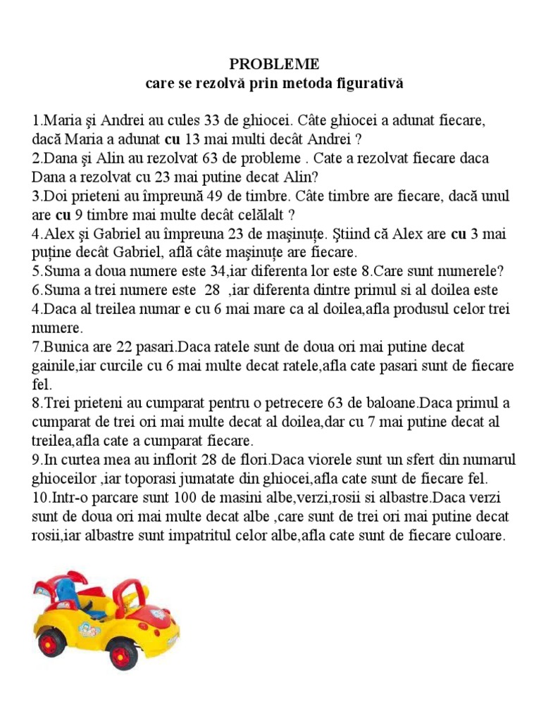 Care sunt metodele tipice și etapele rezolvării unei probleme. Probleme clasa a iv a cu metoda grafica. Așa cum spuneam mai sus fișa de lucru conține șase probleme care se rezolvă prin metoda grafică. Alegerea nu este întâmplătoare.